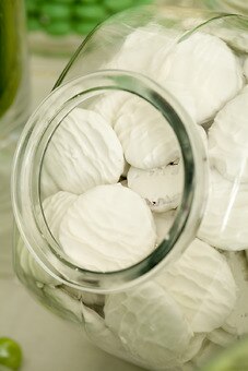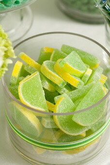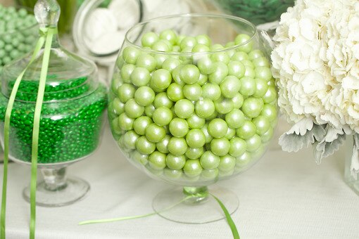 Green and serene, this green candy buffet both sweet and trendy White details - flowers and cookies - add visual interest. Buffet tip: Including color-coordinated fruit (like apples!) in your candy buffet is a nice treat for guests who enjoy a break from candy.