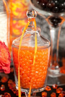 This orange and black candy buffet is elegant and sophisticated. The orange flowers add bursts of happy hues. Buffet tip: Consider the backdrop against which you set your buffet. The background (and table linens) can really add the wow factor to your buffet.