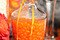 Candy weights (from upper left corner): (1) 7 lbs Diced Coconut; (2) 10 lbs White M&Ms (175 oz container); (3) 10 pieces Tangerine Candy Sticks; (4) 1 lb Twizzlers (Licorice) (125 oz container); (5) 5 lbs Orange Shimmer Gum Balls (140 oz container); (6) 3 lbs Candy Caviar (50 oz container); (7) 5 lbs Orange Fruit Slices (125 oz container); (8) 9 oz Orange Slices (200 oz container); (9) 10 pcs Orange Rock Candy Sticks (Unwrapped); (10) 6 lbs Gummy Peaches (225 oz container); (11) 3 lbs White Chocolate Chips (105 oz container); (12) 5 lbs Black Finnish Licorice (116 oz container); (13) 3 lbs Black Gum Balls (140 oz container); (14) 3 lbs Jelly Belly Tangerine (50 oz container); (15) 4 lbs Sugar-Free Creamsicle Chews (157 oz container); (16) 7 lbs Mochi Rice Cakes (Black Sesame) (170 oz container)